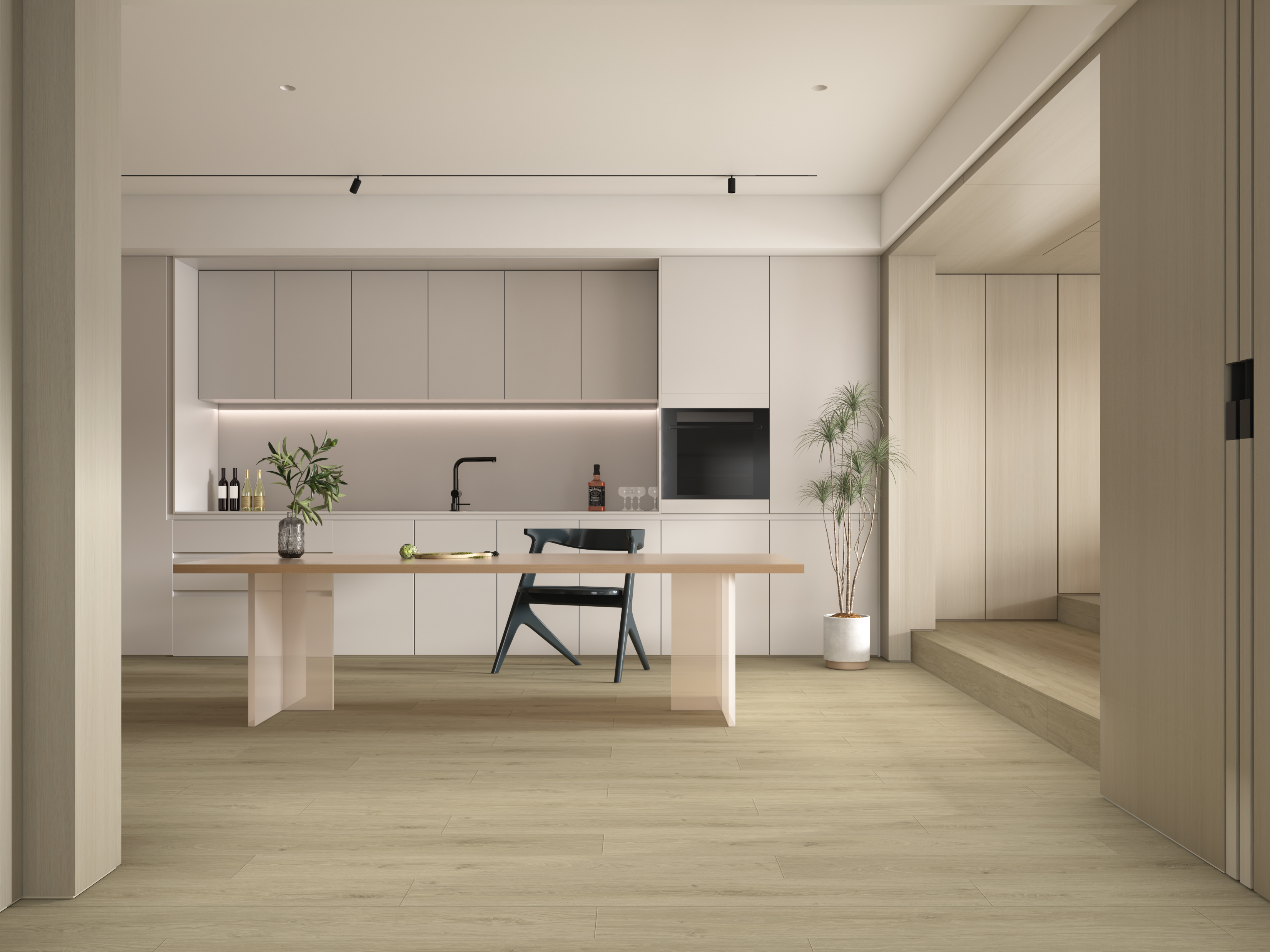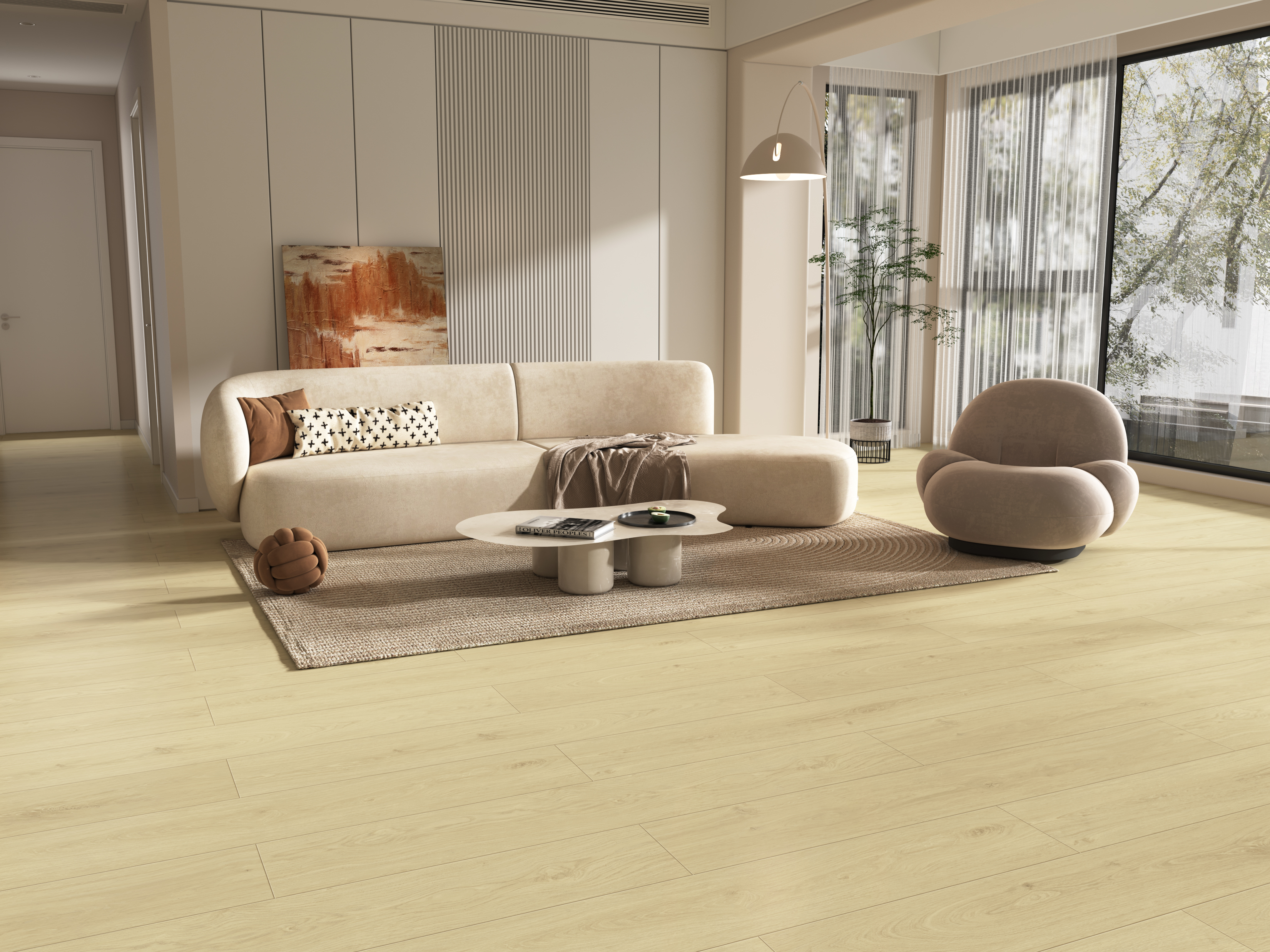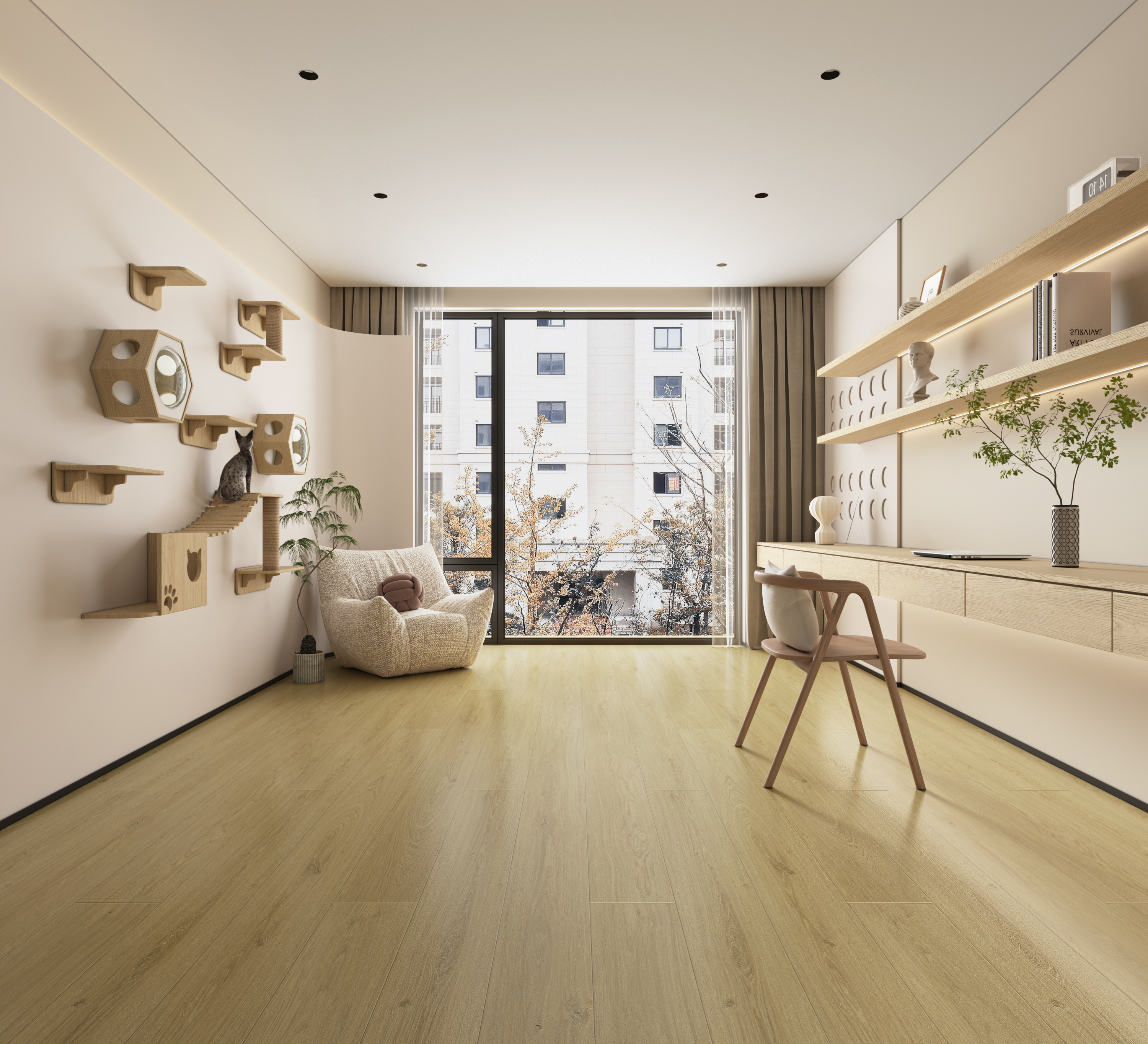 Oak natural-tone flooring remains a timeless choice. The sculpted grain gathers rolling mountain rhythms, with flowing textures and authentic knots. Warm neutral hues feel gentle and versatile, pairing effortlessly with natural wood, cream, or minimalist styles for today’s cozy, calming interiors.