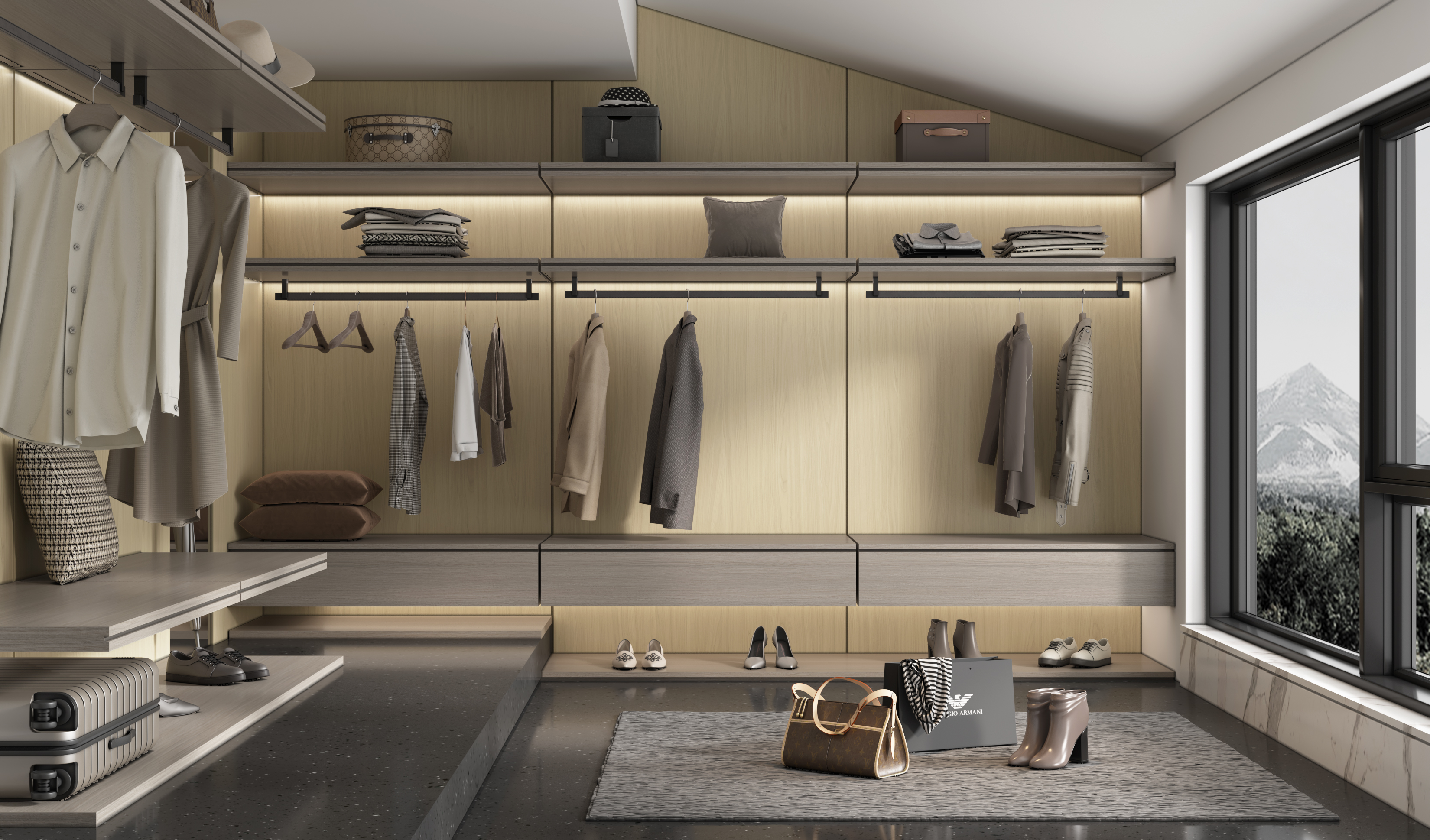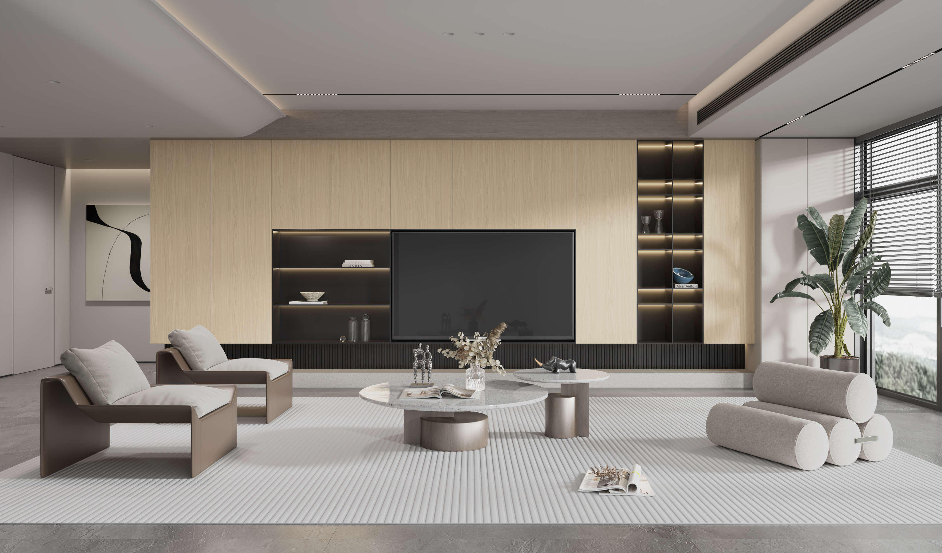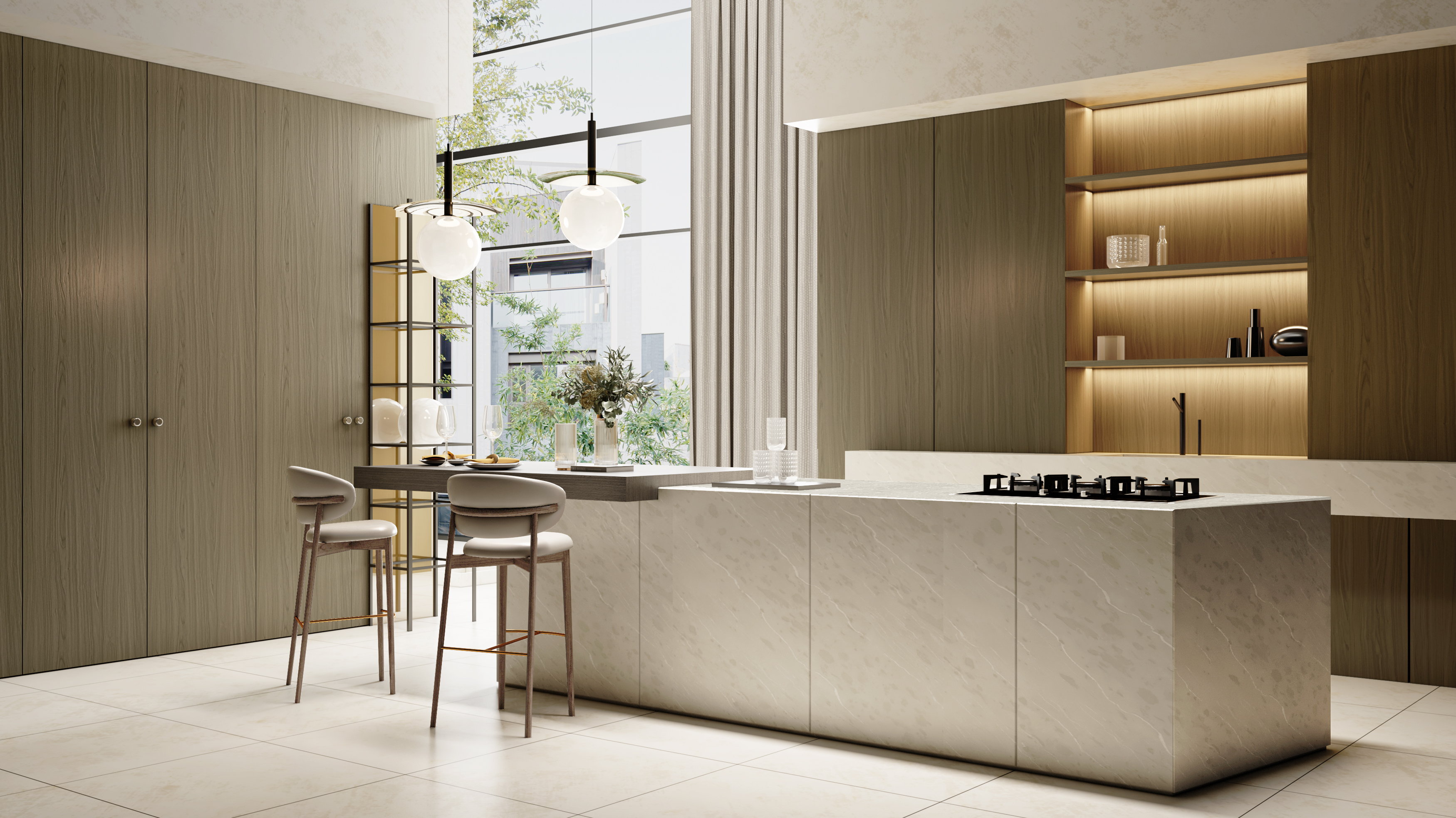 Wise Walnut showcases striking parabolic grain flowing like rivers and mountains, interwoven with straight structures. Richly dimensional and artistic, its calm, refined tones express understated elegance—ideal for both subtle accents and large-scale applications.
