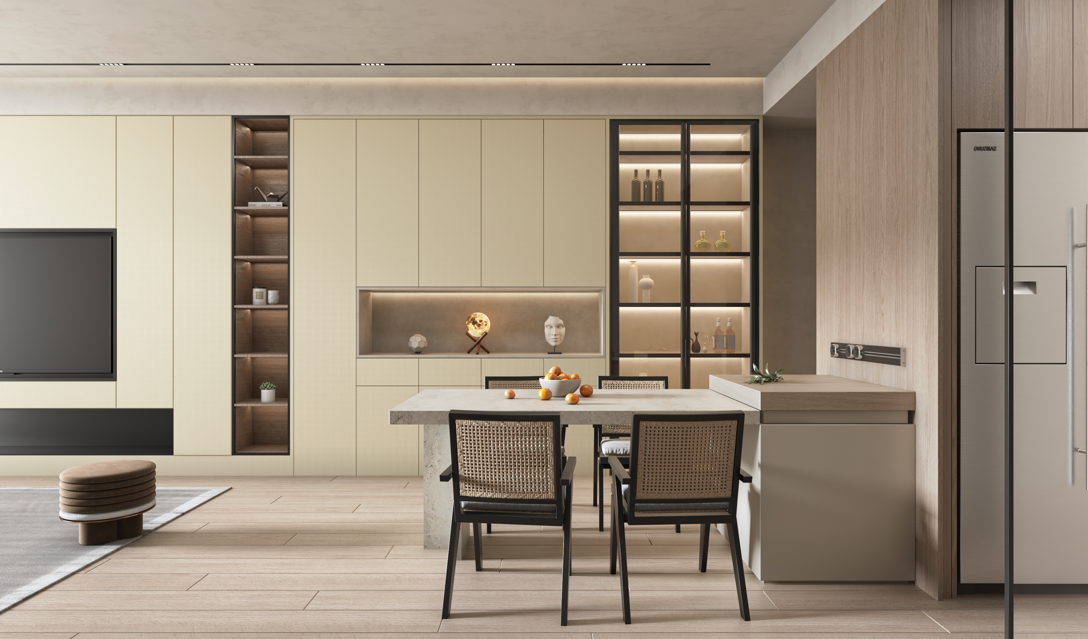 Inspired by luxury textiles, subtle bamboo-weave undertones create a refined, fabric-like texture. Overlapping geometric grids add abstract elegance, while natural beige tones bring warmth and calm. A sophisticated surface for modern and Wabi-Sabi cabinetry.