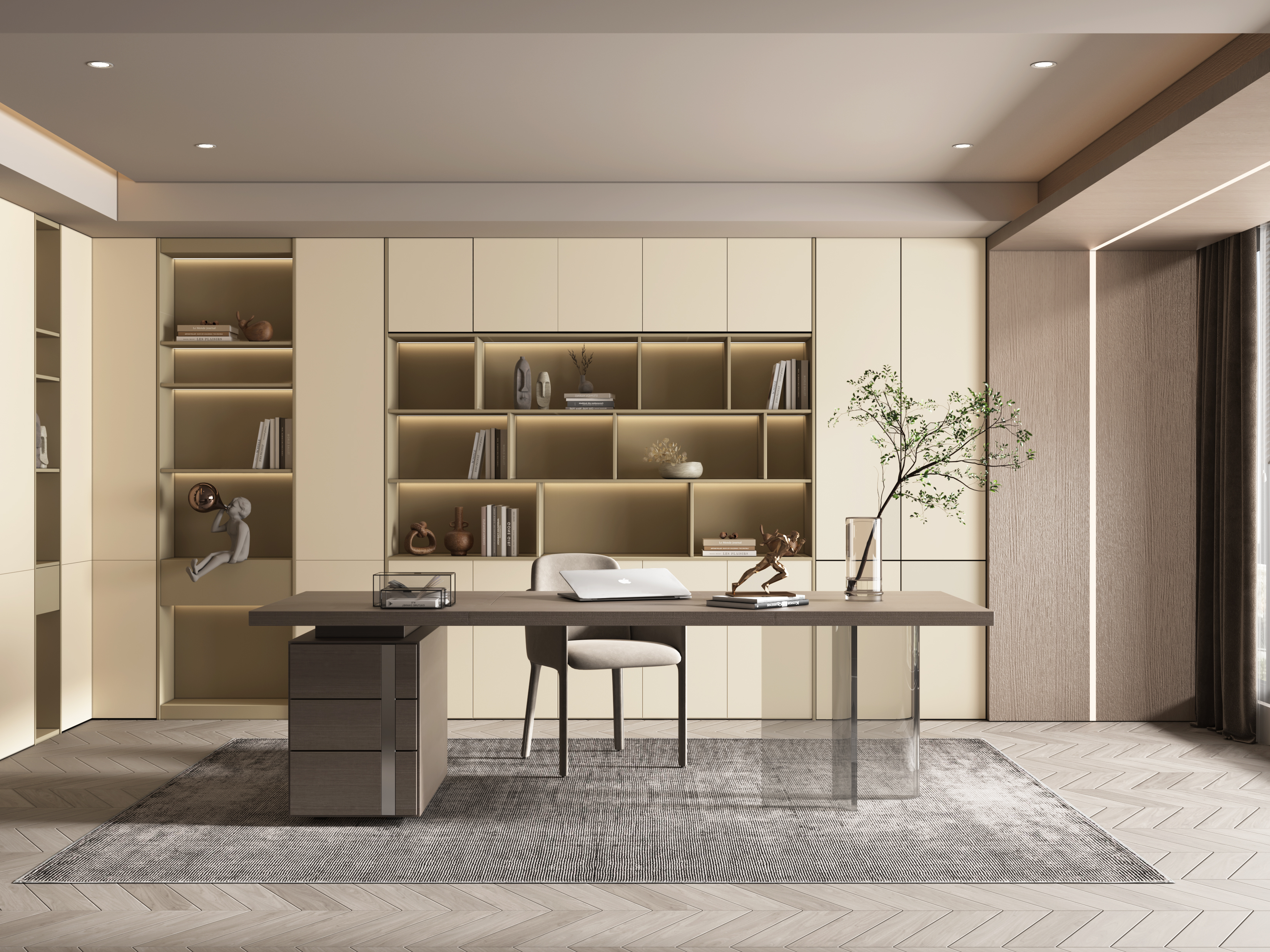 Inspired by Eastern and Western art, this design features a subtle fabric texture with embossed short wood-like lines. The orderly lines create a 3D effect, offering a modern twist to traditional patterns—perfect for furniture, cabinet doors, and interior design.