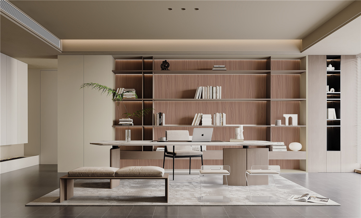 The classic walnut wood features fine and genuine grain texture, exuding a natural charm. The design of the imitation grille lines is soft and gentle at the details, making the edges of the layout less angular. Under the overall clean and rigorous style, there is a hint of antique atmosphere, highlighting the elegant temperament of this pattern. It creates a restrained and high-end atmosphere for the space, making the space more three-dimensional.