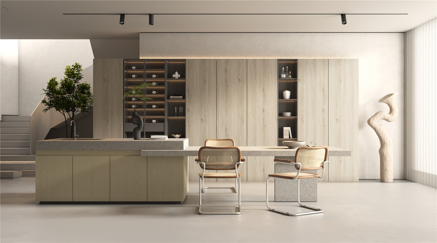 Selected oak grain has a unique, smooth and natural texture. The natural scabincreases the holistic beauty and uniqueness, bring a real feeling more closer tonature. The highly restored original wooden color makes the layout more dexter-ous and ethereality, showing the natural wooden texture. Whether it is applied tocabinet doors or cabinet bodies, it always exude poise and elegance.