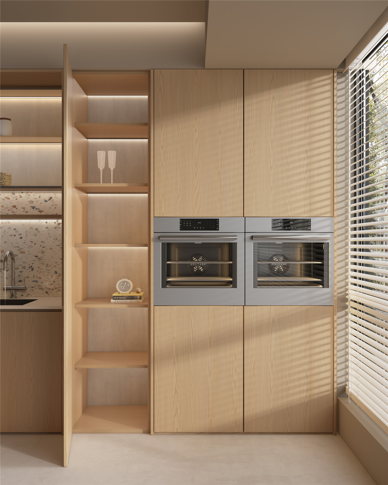 The straight texture lines interweave with the graceful undulating mountain patterns, and the texture structure is distinctive and outstanding, forming a layered layout with varying degrees of concavity and convexity. The modern popular neutral tones blend with the rustic elm wood texture, creating an ultimate contrast and collision between nature and refinement, which evokes resonance between the space and people, and gives rise to the boundless brilliance of life.