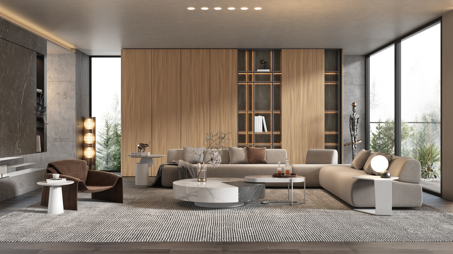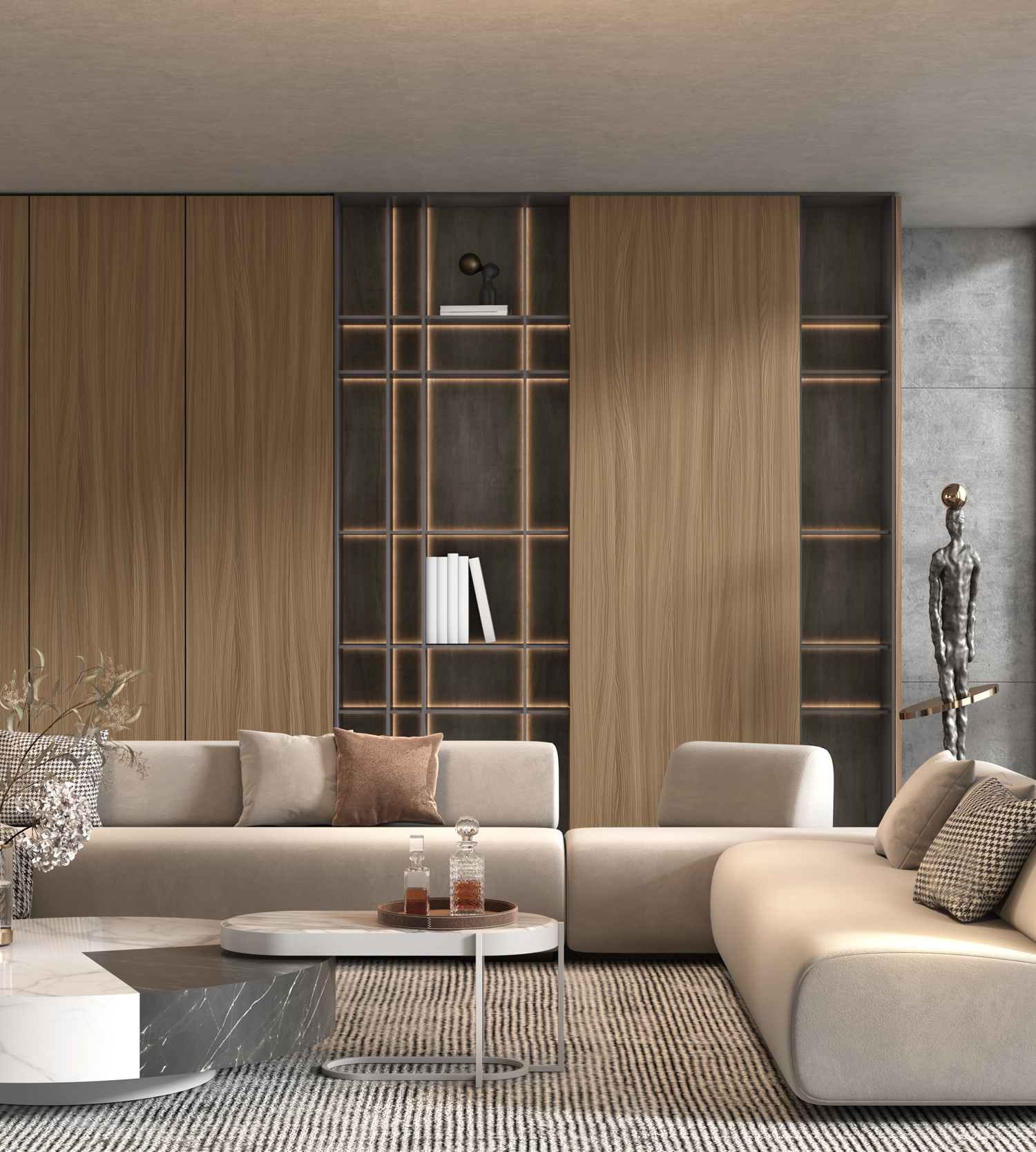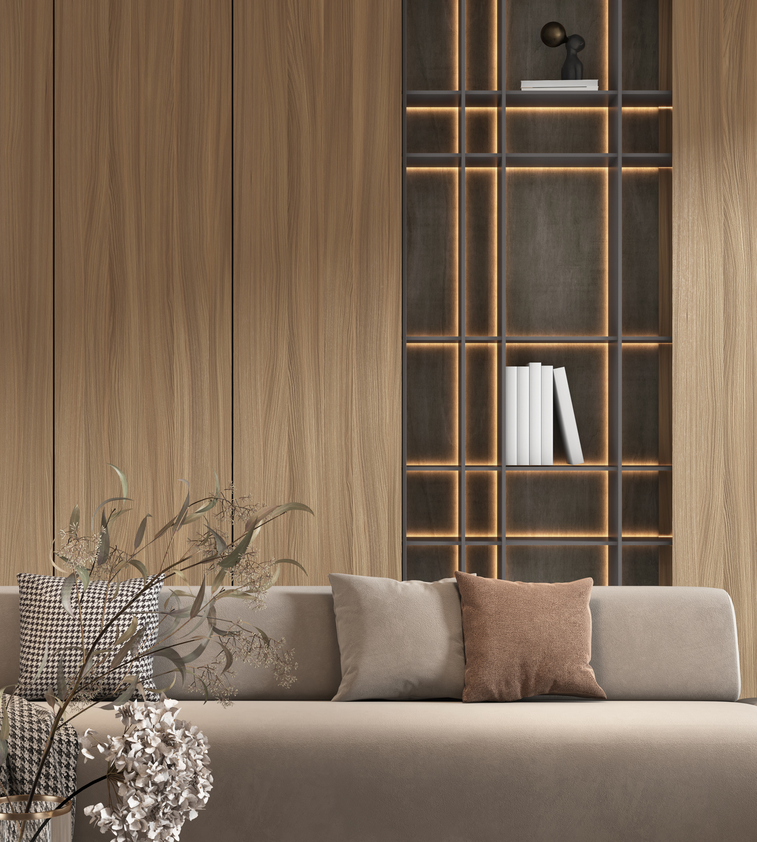 The combination of elm wood's straight grain and the curves of cut-cathedrals breaks monotony, adding depth and liveliness. It retains elm's fluidity while adding softness and variation. The warm color scheme fits the modern preference for an elegant and relaxed lifestyle. The 2460mm non-repeating large roll design enhances visual spaciousness and depth, suitable for both integrated door-wall-cabinet systems and standalone cabinet doors.