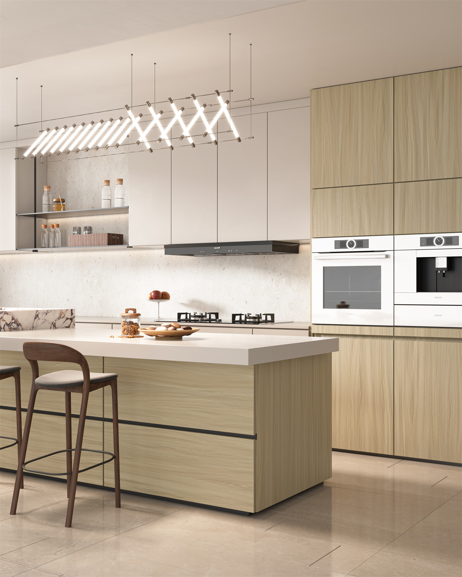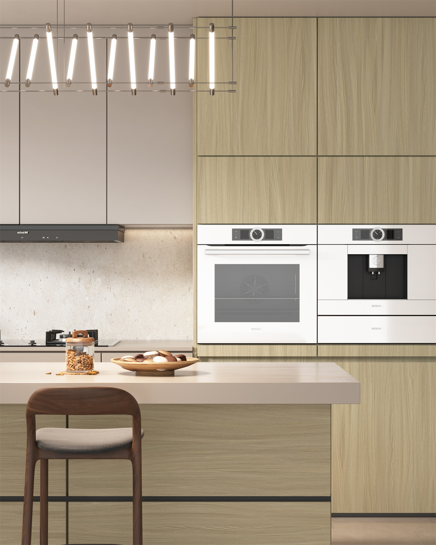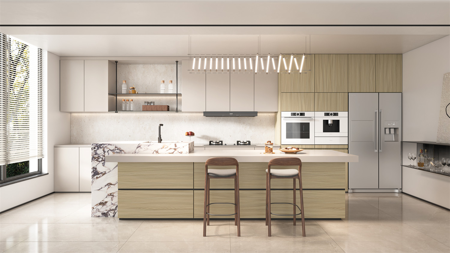 The combination of elm wood's straight grain and the curves of cut-cathedrals breaks monotony, adding depth and liveliness. It retains elm's fluidity while adding softness and variation. The warm color scheme fits the modern preference for an elegant and relaxed lifestyle. The 2460mm non-repeating large roll design enhances visual spaciousness and depth, suitable for both integrated door-wall-cabinet systems and standalone cabinet doors.