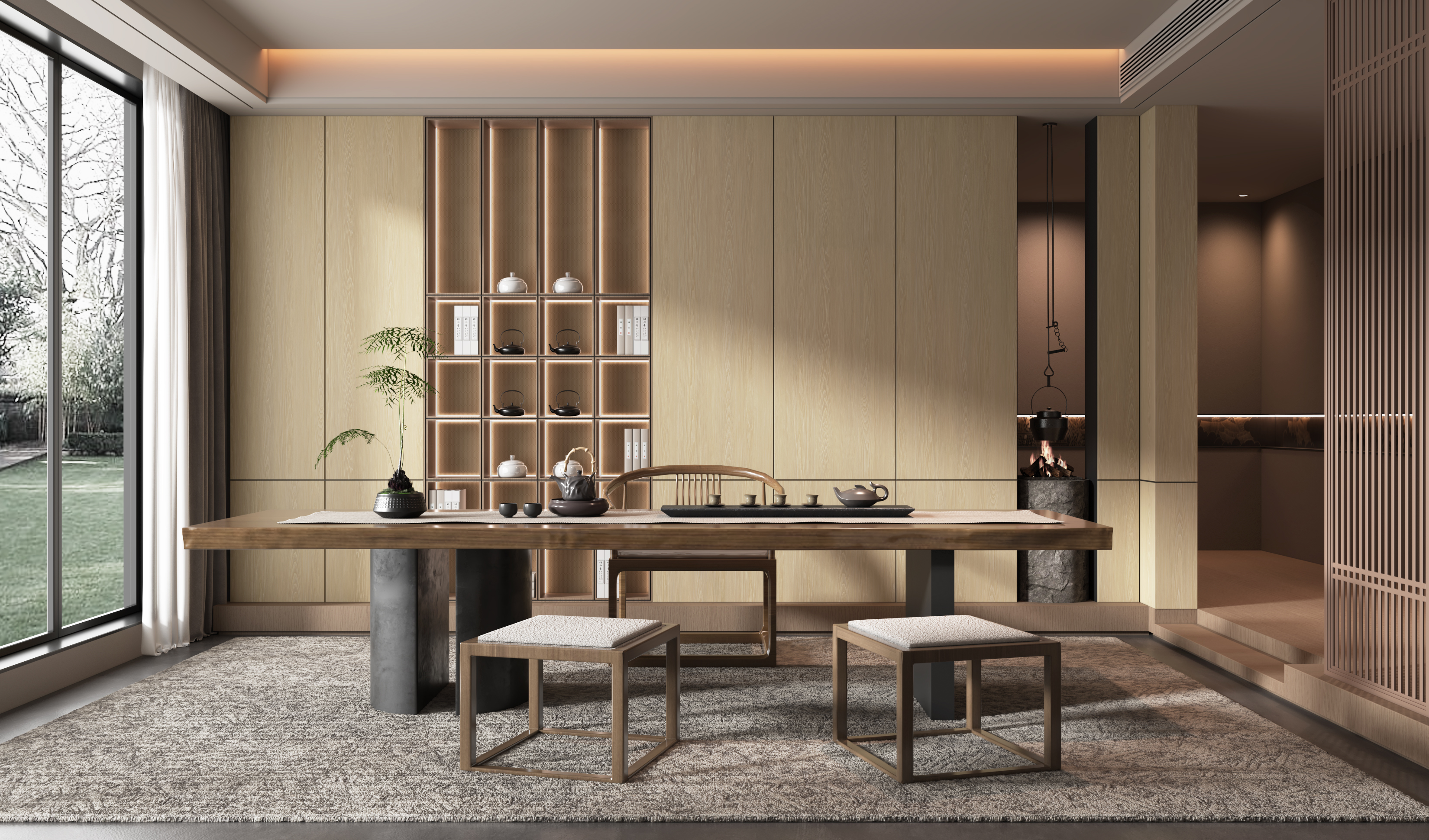 Hickory cathedrals form graceful, ridge-like curves with smooth, flowing lines. Interwoven light and dark tones create clear contrast and depth, enhancing dimensionality and decorative appeal, and giving furniture a distinctive artistic character and refined visual richness.