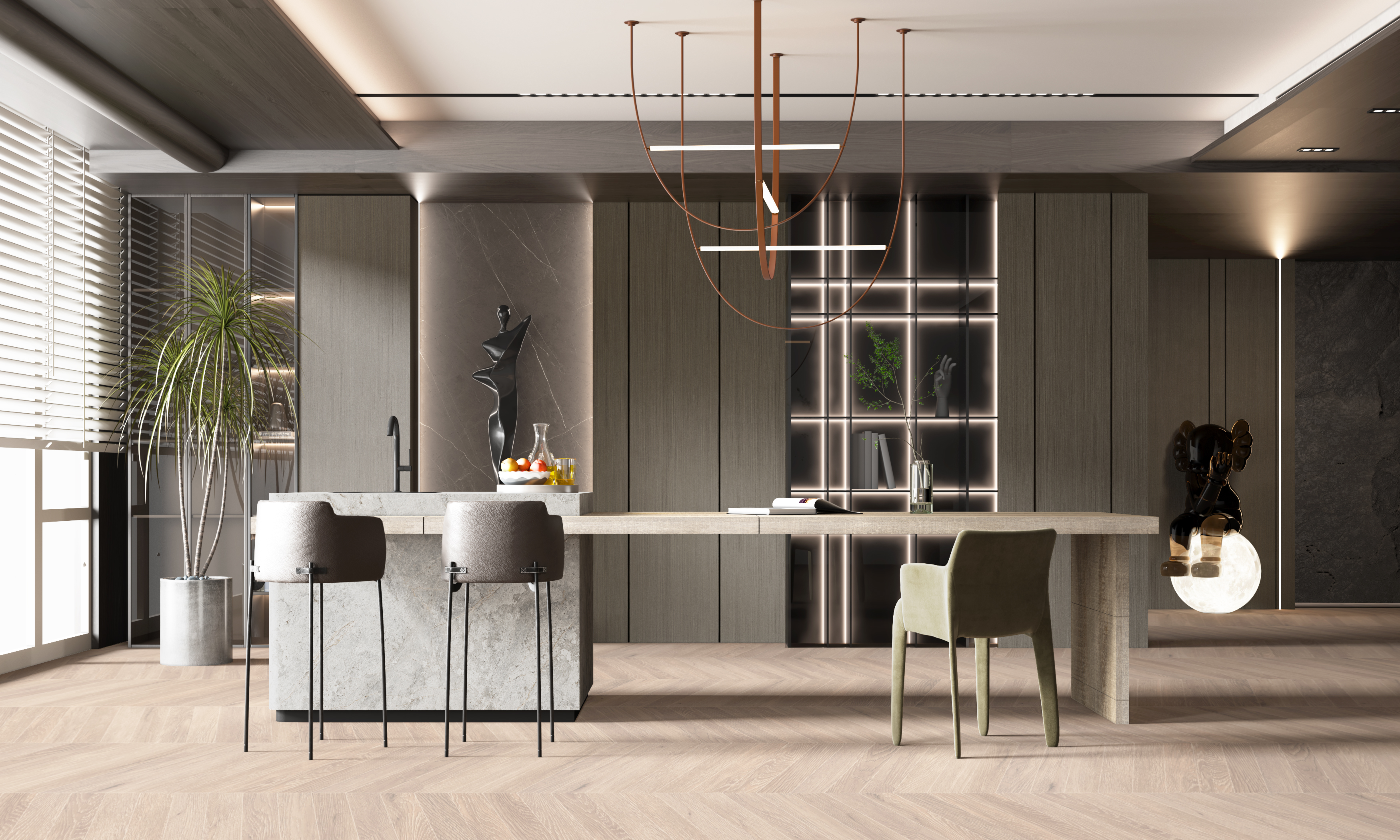 This straight-structure engineered veneer blends a natural base with refined technology. Tight, delicate grain and smooth touch create artistic lines. Neutral tones deliver quiet stability and understated luxury, merging modern sensibility with a subtle connection to nature in interior spaces.
