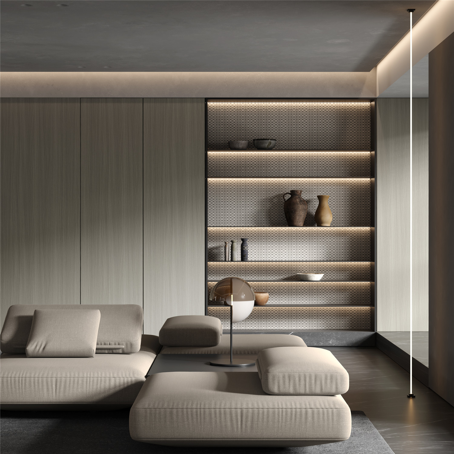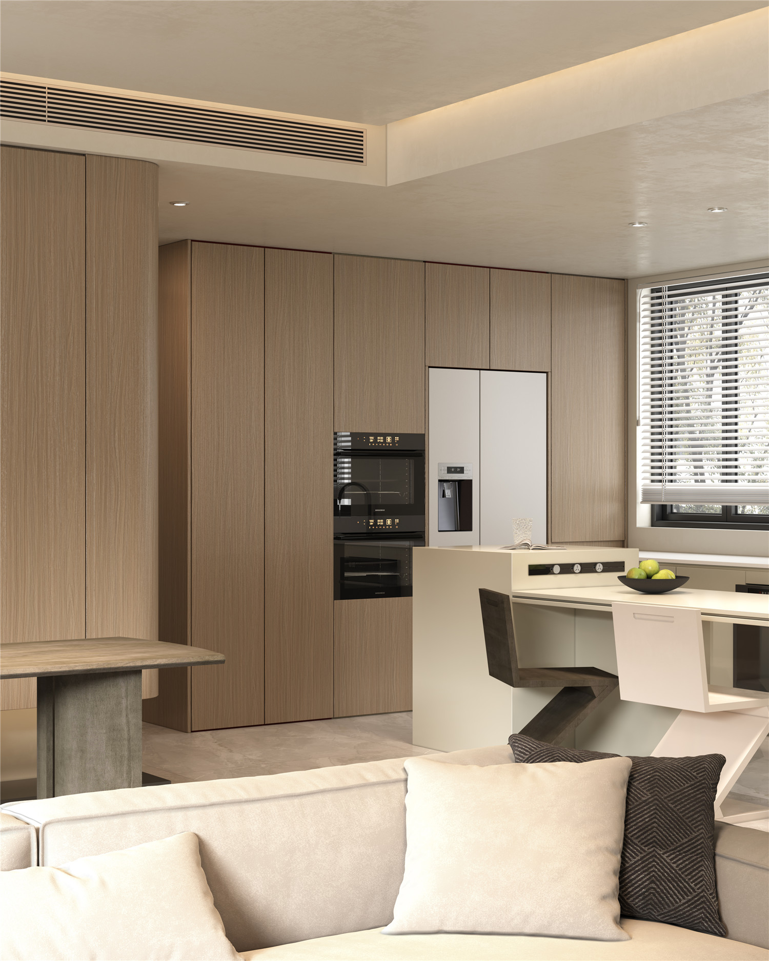 Mainly straight lines with slight undulating cut cathedrals, delicate and rhythmic. Clear and three-dimensional wood details add warmth and vitality. Visually expands space and creates a serene experience.