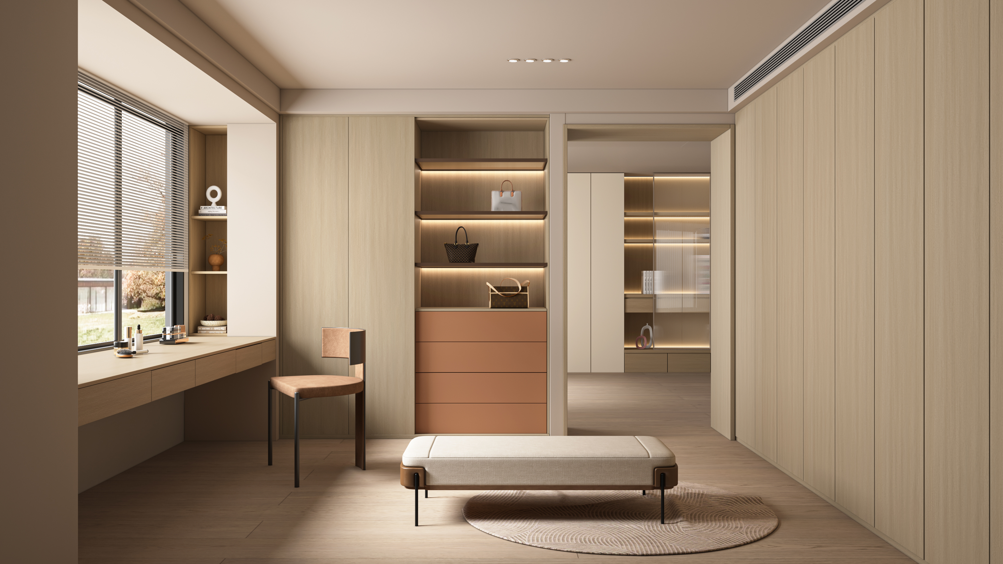 Soft oak straight structures flow gently, paired with low-saturation tones to create a clean, tactile layout. Balanced and refined, the grain feels calm and natural, bringing soothing warmth and a return-to-nature comfort, ideal for creamy and wabi-sabi cabinet applications.